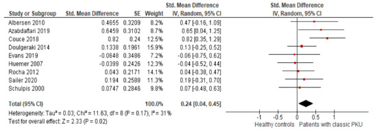 We found that patients with classical PKU had a significantly higher BMI than healthy controls (SMD = 0.24 [0.04, 0.45], p = 0.02; I2 = 31%, p = 0.17).