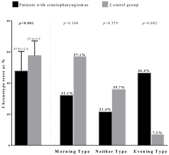 Differences in study parameters of patient with craniopharyngioma according to chronotype categories.
