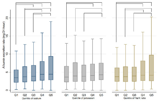 Box-and-whisker plots of 24-h urinary albumin excretion rate for the quintiles of sodium, potassium and sodium-to-potassium ratio. Notes: Q indicates quintile. The lines in the figure connected the pairs that exhibited significant difference for the distribution of AER in the Kruskal Wallis test. The adjusted p value for significance of multiple comparison between quintile groups was 0.0025. The pairs of significant difference were the follows. Sodium quintile: Q1 vs. Q3, Q1 vs. Q4, Q1 vs. Q5, Q2 vs. Q4, Q2 vs. Q5, Q3 vs. Q4, Q3 vs. Q5. Potassium quintile: Q1 vs. Q4, Q1 vs. Q5, Q2 vs. Q5, Q3 vs. Q5. Na/K ratio quintile: Q1 vs. Q4, Q1 vs. Q5, Q2 vs. Q4, Q2 vs. Q5, Q3 vs. Q5.