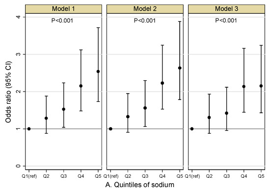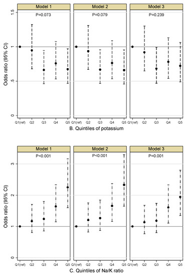 Figure 3A–C presented the main results of the mixed effects logistic regression models. The covariates-adjusted odds ratio (OR) and 95% confidence interval (95%CI) of albuminuria across the quintile intervals of sodium, potassium and Na/K ratio used the first quintile as the reference category. In model 1, when no covariates were adjusted, the third to fifth sodium quintiles were significantly associated with the increased odds of albuminuria compared with the lowest quintile. After adjustment for confounders in model 2 and model 3, the ORs of all quintiles decreased slightly, and the fourth and fifth quintiles of sodium remained significantly associated with higher odds of albuminuria. In model 3, the OR of the fifth quintiles of sodium was 2.154 (95%CI: 1.431, 3.242). In all models, the ORs for the potassium quintiles were primarily insignificant. The fourth and fifth quintiles quintile of the Na/K ratio were significantly associated with increased odds of albuminuria in all three models. In model 3, the OR of the fifth quintiles of Na/K ratio was 1.953 (95%CI: 1.356, 2.813). The p value in Figure 3A–C indicated whether there was a statistically significant association between the quintiles of sodium, potassium and Na/K ratio and the proportion of albuminuria after adjusting for covariates in the logistic regression models. As showed in this figure, quintiles of sodium and Na/K ratio were significantly associated with the proportion of albuminuria in all three models, while quintiles of potassium were not found associated with the outcome variable in any models. Detailed results of the mixed effects logistic regression models were showed in the Supplementary (Table S1).