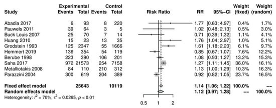In the primary analysis, overall caffeine intake (>100 mg/day) increased the risk of endometriosis by 12%, but this difference was not statistically significant (10 studies; 38,601 participants; RR 1.12, 95% CI 0.97–1.28; I2 = 70%) (Figure 2) when compared to little or no caffeine use (<100 mg/day). Substantial heterogeneity was observed.