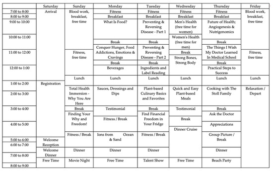 For the trial, 73 adults (37 male, 36 female) voluntarily applied to participate in a one-week, in-house, lifestyle-based “Immersion Program” with a significant other, in the fall of 2019. This program included daily nutrition education; meals that were 100% whole food; plant-based foods (WFPB) with minimal sugar, salt, and oil; cardiopulmonary exercise; and stress management classes. A detailed menu of foods that were made available to the participants is provided in Supplementary Material. Participants were encouraged to consume all provided foods, which constituted three meals per day, and take part in daily exercise and yoga classes although these were not required. There was no caloric or quantity restriction. They attended optional educational lectures on nutrition for 2–5 h each day, which were organized and primarily delivered by a physician team. Participants were encouraged to stay in the provided hotel room. During the welcome dinner, the research project was discussed. The itinerary for the program is provided in Figure 1. The Immersion Education Program involved 15 h of nutritional education, five hours of dedicated fitness (with three additional hours of sports/games such as relay races, kick ball, and volleyball), two hours of stress reduction education, and four 1-hr cooking demonstrations.