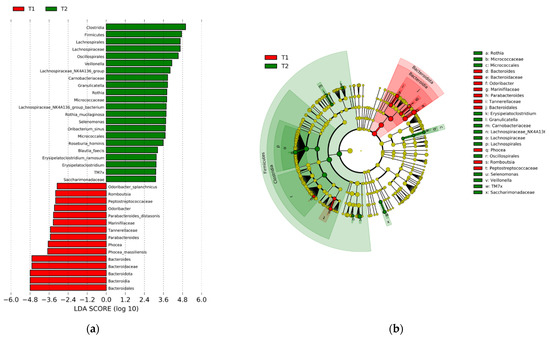 Microbial shifts across the intervention among the most abundant taxa. (a) Bacterial taxa significantly increased in subjects at T1 (red) versus T2 (green) as identified by Linear discriminant analysis Effect Size (LEfSe) analysis; (b) bacterial clades of the respective bacteria.