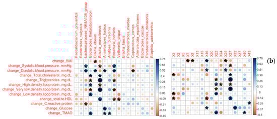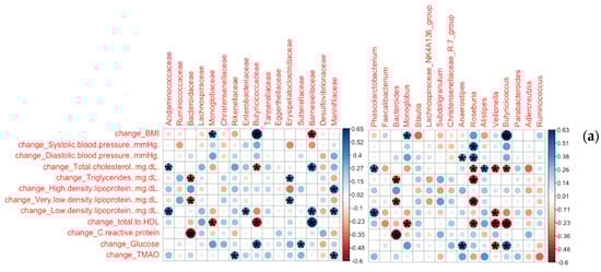 Change in relative abundances correlated with change in anthropometric measures. Spearman correlation of change in relative abundance and change in anthropometric measures across the intervention. Significant correlations are marked with an asterisk, with color and size of the circle indicative of the strength of correlation at right. (a) Family and genus level correlations; (b) species and ASV level correlations. ASV sequence IDs indicated by X. BMI, body mass index; HDL, high-density lipoprotein; TMAO, trimethylamine N-oxide.