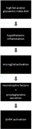 Valsamakis, G.; Arapaki, A.; Balafoutas, D.; Charmandari, E.; Vlahos, N.F. Diet-Induced Hypothalamic Inflammation, Phoenixin, and Subsequent Precocious Puberty. Nutrients 2021, 13, 3460. https://doi.org/10.3390/nu13103460