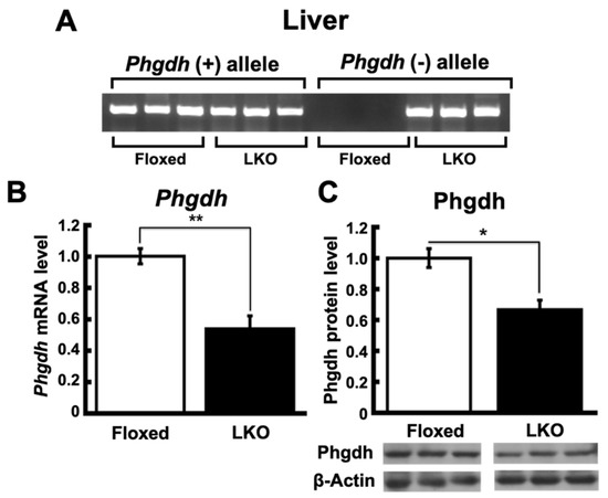 To inactivate Phgdh in a liver-hepatocyte-specific manner, the Phgdh allele was disrupted by crossing the female Floxed mice (Phgdh flox/flox) with male mice expressing Cre under the control of the albumin promoter (referred to as Alb-Cre mice). We obtained mice in subsequent generations with the Alb+/Cre;Phgdh flox/flox genotype, referred to as LKO. The Floxed allele of Phgdh without exon deletion (Phgdh flox) was detected in the livers of both Floxed and LKO mice, while the null allele lacking the fourth and fifth exons of Phgdh (Phgdh-) was detected only in the liver (Figure 1A), but not in the kidney of LKO mice (data not shown). The efficacy of Cre-mediated deletion of Phgdh was assessed by qRT-PCR and Western blotting. The mRNA and protein levels of Phgdh in the liver of LKO mice were lower than those in Floxed mice (Figure 1B,C). The expression of Phgdh mRNA and protein was significantly reduced but not completely abolished in the liver of LKO mice because the Cre-mediated recombination by the Alb-Cre transgene occurred only in hepatocytes, and the Phgdh expression was maintained in other cell types in the liver of LKO mice.