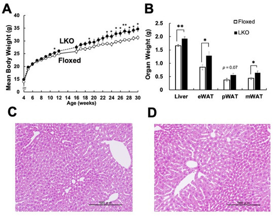 Hepatocyte-specific deletion of Phgdh causes the weight gain. (A) Growth curve of Floxed (white node) and LKO (black node) mice from 4 to 30 weeks (n = 6 each). (B) The body weight and the organ weight of the liver, epididymal white adipose tissue (eWAT), parametrial white adipose tissue (pWAT), and mesenteric white adipose tissue (mWAT) were measured in Floxed and LKO mice at 30 weeks (n = 6 each). (C,D) Histological evaluation of the liver in Floxed (C) and LKO (D) mice at 28 weeks (n = 5 each). Representative images are shown. Scale bar, 500 μm. Student’s t-test, * p < 0.05, ** p < 0.005.