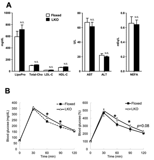 Measurement of serum biochemical markers. (A) The values of the serum biochemical test of lipoprotein (Lipopro), total cholesterol (Total-Cho), LDL cholesterol (LDL-C), HDL cholesterol (HDL-C), aspartate transaminase (AST), alanine transaminase (ALT), and non-esterified fatty acid (NEFA) (n = 6 each). (B) Blood glucose level in Floxed (black square node) and LKO (white triangle node) mice after glucose administration (Floxed: n = 4, LKO: n = 6). Left graph shows the concentration of blood glucose, and right graph shows the rate of increase of blood glucose. Student’s t-test, * p < 0.05. N.S.: not significant.