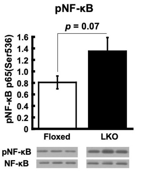 To assess whether hepatocyte-specific Phgdh deletion in the liver modulates gene expression, we performed a microarray analysis of liver mRNA. We identified 2770 genes that were significantly differentially expressed in the liver of LKO mice compared to that of Floxed mice (see Materials and Methods). Among them, 1191 genes were downregulated (<0.90–0.17-fold) and 1579 genes were upregulated (>1.1–4.9-fold) (Figure S2). A KEGG pathway analysis by DAVID demonstrated that the PPAR signaling pathway, which regulates lipid metabolism in the liver, was enriched in the upregulated DEGs in the liver of LKO mice (Table 2A), while the phosphoinositide 3-kinase (PI3K)‒Akt signaling pathway, which is involved in intracellular insulin signaling, was enriched in the downregulated DEGs of the liver in LKO mice (Table 2B). An ingenuity pathway analysis (IPA) was also performed to identify the affected gene networks and canonical signaling pathways. By analyzing DEGs in the liver of LKO mice, IPA identified the IL-10 signaling network (Supplementary Figure S3) and generated lists of significantly affected “canonical pathway” (Table 3A), “disease and disorder” (Table 3B), and “hepatotoxicity” (Table 3C). These include IL-12 signaling pathways in the top canonical pathway, multiple hepatotoxicity, and hepatic system diseases. These results suggest that Phgdh deletion in hepatocytes induces the dysregulation of multiple canonical pathways in the liver. Since it has been well documented that inflammation deteriorates systemic insulin sensitivity and obesity [17], we tested whether an inflammation-related response occurred in the liver of LKO mice. First, we examined the phosphorylation of nuclear factor-kappa B (NF-κB), which serves as an essential transcription factor for inflammatory responses. The phosphorylated NF-κB at Ser-536 showed an increasing trend in the liver of LKO mice compared to Floxed mice (Figure 4). These observations reveal the occurrence of inflammation-related molecular changes in the liver of LKO mice.