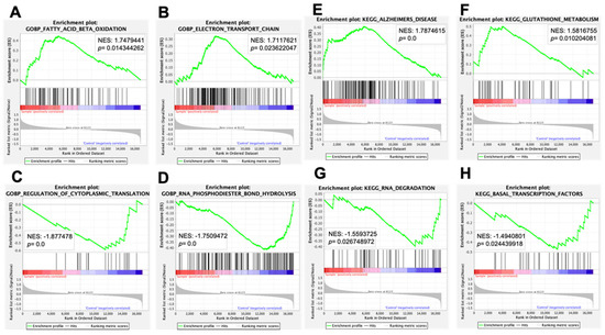 Identification of positively and negatively correlated gene sets in the liver of LKO mice in GO terms and KEGG pathways by gene set enrichment analysis (GSEA). The enrichment plots of GSEA showed positively correlated gene sets in fatty acid beta oxidation (A), electron transport chain (B), negatively correlated gene sets in regulation of cytoplasmic translation (C), and RNA phosphodiester bond hydrolysis (D) of GO terms. The enrichment plots of GSEA showed positively correlated gene sets in Alzheimer’s disease (E) and glutathione metabolism (F) and negatively correlated gene sets in RNA degradation (G) and basal transcription factors (H) of KEGG pathways. Nominal enrichment scores (NESs) and p-values are indicated in each enrichment plot.