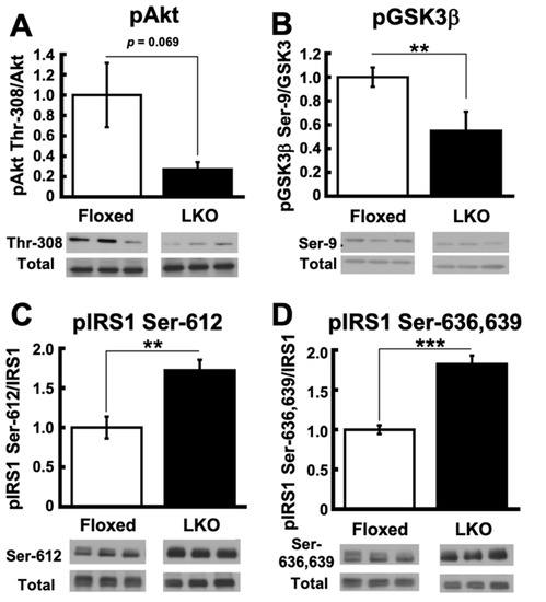 Since the current KEGG pathway analysis in DAVID points to an alteration in the intracellular insulin signaling cascade in the liver of LKO mice (Table 2B), we examined protein phosphorylation of components in the cascade. Western blot analysis demonstrated a trend toward decreasing phosphorylation of Akt at Thr-308 (Figure 6A), and a significant reduction in the phosphorylation of GSK3β at Ser-9 (Figure 6B) in the liver of LKO mice. Glycogen synthase is negatively regulated by inhibitory phosphorylation by GSK3β, which is also negatively regulated by Akt phosphorylation at serine-9 [18,19]. Decreased phosphorylation levels of Akt and GSK3β coincide with impaired glucose tolerance in the liver of LKO mice. We then examined the phosphorylation status of insulin receptor substrate 1 (IRS-1) because serine/threonine phosphorylation of IRS-1 is closely related to insulin resistance [20,21,22]. Among them, it is well documented that the phosphorylation of IRS-1 at Ser-612 and Ser-632/635 residues is negatively correlated with insulin signaling [23,24]. The phosphorylation levels of Ser-612 and Ser-632/635 were significantly higher in the livers of LKO mice than in Floxed mice (Figure 6C,D). Taken together, these observations indicate insulin resistance in the liver of LKO mice.