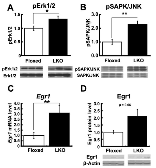 To examine the dysregulation of kinases directing IRS-1, we measured the phosphorylation of Erk1/2 and stress-activated protein kinase (SAPK)/Jun amino-terminal kinase (JNK), which phosphorylates the Ser-632/635 residues of IRS1 [20]. The phosphorylation of Erk1/2 and SAPK/JNK was significantly increased in the liver of LKO mice compared to Floxed mice (Figure 7A,B). Since the phosphorylation of Erk1/2 is regulated by early growth response (Egr)-1 in type 2 diabetic mice [25], we compared the Egr-1 expression in the liver of LKO and Floxed mice. The Egr-1 mRNA and protein levels showed a significant increase (Figure 7C) and a trend toward increasing levels, respectively, in the liver of LKO mice (Figure 7D). These results suggest that the activation of Egr-1 the Erk1/2 axis contributes to the negative regulation of insulin signaling at IRS-1 in the liver of LKO mice.