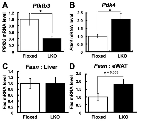 To gain an insight into the dysregulation of the enzymes regulating glucose metabolism under diminished insulin signaling in the liver of LKO mice, we examined the mRNA expression of 6-phosphofructo-2-kinase/fructose-2,6-biphosphatase 3 (Pfkfb3) and pyruvate dehydrogenase kinase 4 (Pdk4) as insulin-regulated regulators of glycolysis and gluconeogenesis, respectively [26,27]. Pfkfb3 encodes 6-phosphofructo-2-kinase/fructose-2,6-bisphosphatase synthesizing fructose 2,6-bisphosphate, the glycolytic activator that promotes the conversion of fructose 1,6-bisphosphate to fructose 6-phosphate, a rate-limiting reaction in the glycolytic pathway [28]. Pdk4 inhibits the conversion of pyruvate to acetyl-CoA by inhibiting the phosphorylation of pyruvate dehydrogenase, which leads to suppression of glucose oxidation in the glycolytic pathway [29]. The mRNA levels of Pfkfb3 in the liver were significantly reduced in LKO mice compared to Floxed mice (Figure 8A), while the mRNA levels of Pdk4 in the liver were significantly increased in LKO mice compared to Floxed mice (Figure 8B). These gene expression profiles suggest diminished glucose oxidation and coincide with diminished insulin signaling in the livers of LKO mice. In addition to these results, we evaluated fatty acid synthesis to measure Fasn mRNA levels in the liver and adipose tissue. The mRNA levels of Fasn were not increased in the liver (Figure 8C) but increased in the eWAT (Figure 8D). These results suggested that steatosis did not progress, but fat accumulation in the adipose tissue was enhanced.
