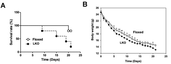 Effect of body weight and survival rate by feeding LKO mice a protein-free diet. (A) The transition of body weight in Floxed mice (white node) and LKO mice (black node) after feeding protein-free diet. (B) The transition of survival rate in Floxed and LKO mice during feeding protein-free diet. n = 5 each. Student’s t-test, * p < 0.05, ** p < 0.005.