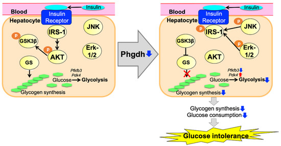 A summary of the molecular mechanisms caused by Phgdh deletion in hepatocytes, as inferred by this study. Phgdh deletion in hepatocytes impairs insulin signaling via IRS-1 phosphorylation. Akt inactivation by impaired insulin signaling induced the suppression of gluconeogenesis. Enhanced glycolysis resulted in mild obesity and glucose intolerance.