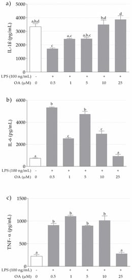 Effects of OA on proinflammatory cytokines production by THP-1 macrophages induced by LPS. Control cells were incubated with DMSO. Experiments performed in triplicate. (a) IL-1β; (b) IL-6; (c) TNF-α. Different letters indicate significant difference (p < 0.05) by one-way ANOVA analysis and Tukey’s post hoc test.