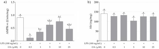 AMPK-α levels in LPS-stimulated THP-1 cells increased dose-dependently up to 10 µM. In contrast, at 25 µM, the concentration was lower than at 10 µM (Figure 2a). The LPS-stimulated THP-1 macrophages pretreated with 0.5 and 1 µM of OA had significantly lower levels of AMPK-α in comparison to non-LPS-stimulated THP-1 macrophages treated with DMSO. Therefore, 10 µM was the concentration at which OA was more effective in attenuating the dephosphorylation of AMPK-α induced by LPS. No significant differences were observed in the levels of Akt (Figure 2b).