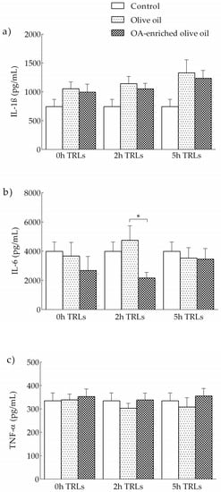 TRL production of proinflammatory cytokines by THP-1 macrophages incubated with TRLs obtained from healthy adolescents before, and at 2 and 5 h after the intake an OA-enriched olive oil or non-functional olive oil. Control cells incubated with PBS. (a) IL-1β; (b) IL-6; (c) TNF-α. * p < 0.05.