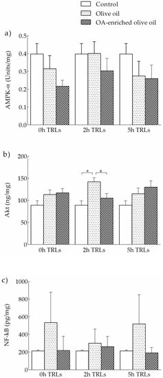 Levels of AMPK-α (a), Akt (b) and NF-κB (c) in THP-1 macrophages incubated with TRL obtained from healthy adolescents before, and at 2 and 5 h after the intake an OA-enriched olive oil or non-functional olive oil. Control cells incubated with PBS. * p < 0.05.