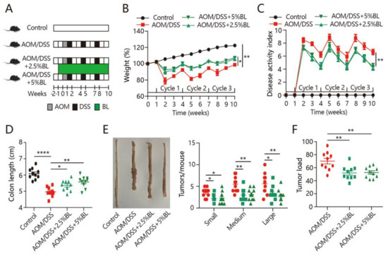 3.1. BL Prevents Colitis Symptoms and Tumorigenesis