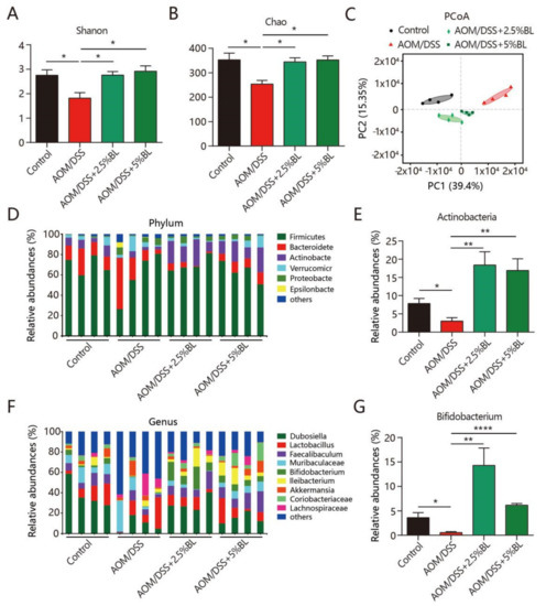 3.6. BL Attenuates Dysbiosis of Gut Microbiota