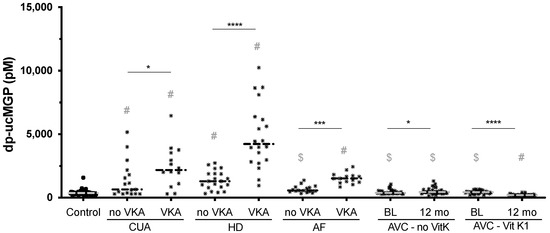 dp-ucMGP measurements of all disease cohorts and a control group. VKA use exacerbated dp-ucMGP status in all cohorts, while vitamin K supplementation ameliorated the dp-ucMGP status beyond healthy controls. Compared to controls, all HD and CUA groups had significantly increased dp-ucMGP levels, while in the AF cohort only the VKA group was increased. Dash indicates the median. Significance levels: * = p ≤ 0.05; *** = p ≤ 0.001; **** = p ≤ 0.0001. # and $ indicate the comparison between each disease group and the control group. # indicates a significance level of p ≤ 0.0001, and $ indicates no significant difference between the respective group and the control group.