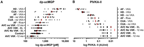 To gain an overview of the vitamin K status, all groups were separated by PIVKA-II and dp-ucMGP measurements and ranked by their respective median values. Among all groups, dp-ucMGP levels are higher in patients using VKA, with HD and CUA patients showing higher levels than AF patients. AVC patients supplemented with vitamin K1 showed the lowest dp-ucMGP plasma levels (Figure 2A). For PIVKA-II, the rank was different. AF–VKA patients showed higher PIVKA-II levels. CUA patients have lower PIVKA-II plasma levels than AF and HD patients. AVC patients supplemented with vitamin K1 showed the lowest PIVKA-II levels. (Figure 2B).