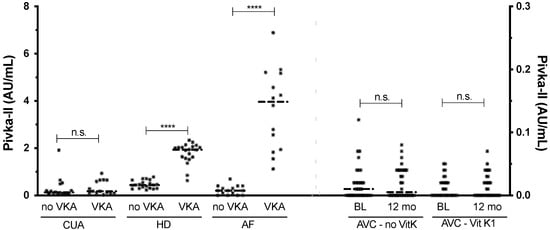 PIVKA-II measurements of all cohorts. HD and AF patients had higher PIVKA-II levels with VKA use. CUA and AVC cohorts did not change with VKA or vitamin K supplementation, respectively. CUA, HD and AF values correspond to the left Y-axis, and AVC values correspond to the right Y-axis. The dash indicates the median. Significance levels: n.s. = p > 0.05; **** = p ≤ 0.0001.