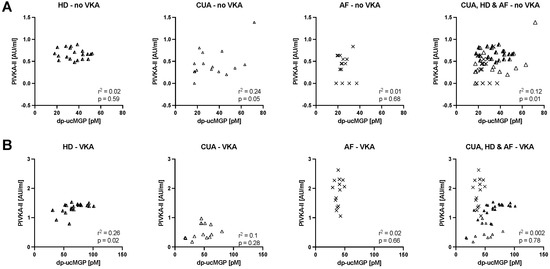 Weak correlations between PIVKA-II and dp-ucMGP of all patients of the CUA, HD and AF cohorts, separated into panel A) without VKA treatment (r2 ≤ 0.24) and panel B) with VKA treatment (r2 ≤ 0.26). Symbols in the right most graph correspond to the respective patient group.