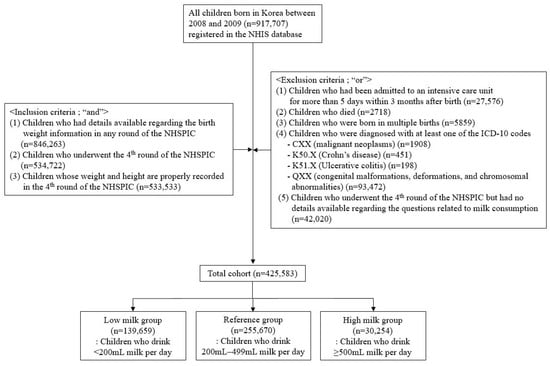 All children who were born during 2008–2009 and who participated in the health screening program were identified (n = 917,707). We included children (1) who had details available regarding birth weight information in any round of the NHSPIC, (2) who underwent the 4th round of NHSPIC, and (3) whose weight and height were properly recorded in the 4th round of NHSPIC (n = 533,533). Children that were excluded included those (1) who had been admitted to an intensive care unit for more than 5 days within 3 months after birth, (2) who died, (3) who were born in multiple births, (4) who were diagnosed with at least one of the ICD-10 codes (CXX (malignant neoplasms), K50.X (Crohn’s disease), K51.X (ulcerative colitis), and QXX (congenital malformations, deformations, and chromosomal abnormalities)), or (5) who underwent the 4th round of NHSPIC but had no details available regarding the questions related to milk consumption. In total, 425,583 children were included in this study, and they were divided into three groups based on daily milk consumption (Figure 1).