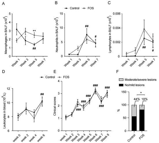 Effect of FOS on BALF and blood cell compositions and clinical and lung scores in calves. Numbers of (A) macrophages, (B) neutrophils, and (C) lymphocytes in BALF and (D) leukocyte concentrations in blood were analyzed for a subset of calves (n = 40, 20 calves/treatment). (E) Clinical scores and (F) proportion of different lung lesions at slaughter were evaluated for all calves (n = 100, 50 calves/treatment). Significantly different from week 0 or 1 for control: # p < 0.05; ## p < 0.01; ### p < 0.001. Significantly different from control at that time: * p < 0.05; ** p < 0.01. Data are presented as means ± SEM unless otherwise indicated. Data are presented as percentage for panel F. BALF, bronchoalveolar lavage fluid; FOS, fructo-oligosaccharides.