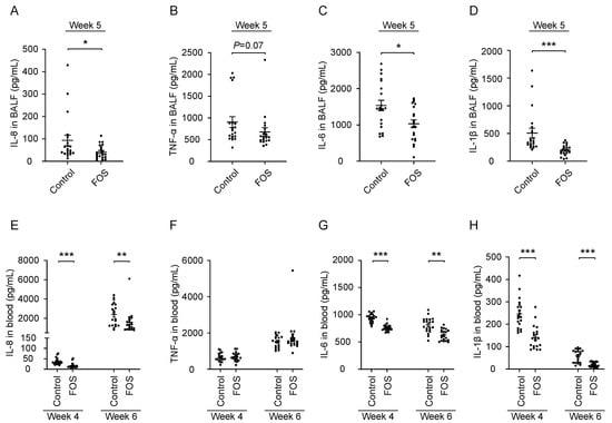 The inflammatory response in the lungs was investigated by measuring the cytokines/chemokines in the BALF at week 5. FOS lowered the concentrations of IL-8 (p < 0.05), IL-6 (p < 0.05), and IL-1β (p < 0.001), and tended to also lower the concentration of TNF-α (p = 0.07) in BALF at week 5 (Figure 2A–D). The same cytokines/chemokines were measured in blood to investigate the effect of FOS on the systemic inflammation at weeks 4 and 6. Oral FOS lowered the concentrations of IL-8 (p < 0.001 and p < 0.01, respectively), IL-6 (p < 0.001 and p < 0.01, respectively) and IL-1β (p < 0.001 and p < 0.001, respectively) in blood at both week 4 and week 6, while no effects on the TNF-α levels were observed (Figure 2E–H).