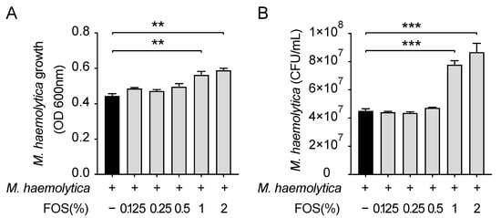 Due to the possible presence of FOS in the systemic circulation after oral administration [11,12,13,14], different NDOs may exert direct effects on the airway pathogens or epithelial cells. Here, 1% and 2% FOS significantly increased the growth (p < 0.01 and p < 0.01, respectively) and CFUs (p < 0.001 and p < 0.001, respectively) of M. haemolytica in vitro, while FOS < 1% did not (Figure 3).