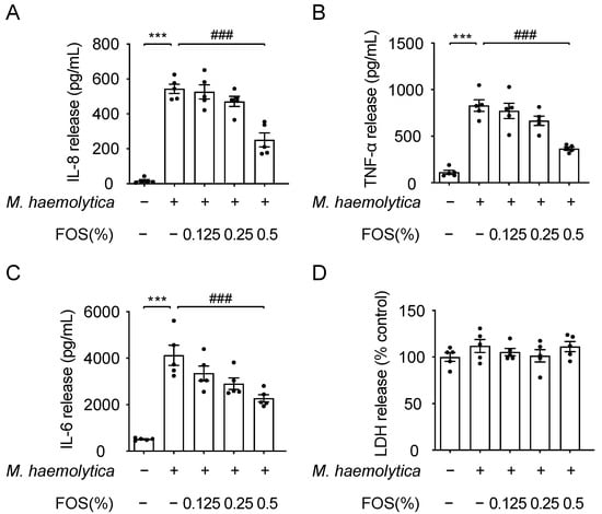 Anti-inflammatory effects of FOS were investigated in an ex vivo infection model based on PBECs of healthy calf lungs [6]. M. haemolytica induced the release of IL-8 (p < 0.001), TNF-α (p < 0.001) and IL-6 (p < 0.001) in PBECs, while the release was significantly inhibited by the pretreatment with 0.5% FOS (p < 0.001, p < 0.001, and p < 0.001, respectively) (Figure 4A–C). Moreover, M. haemolytica with or without the pre-administration of FOS did not affect LDH release in PBECs (Figure 4D).