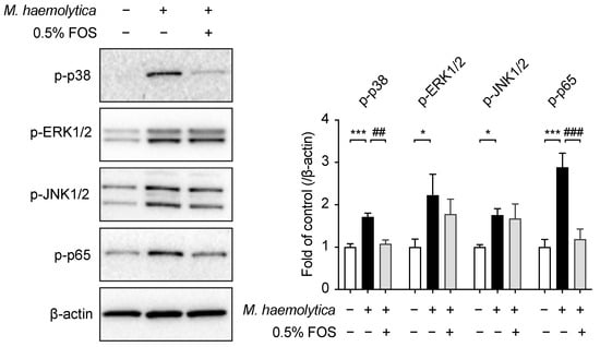 The activation of the MAPK and NF-κB signaling pathways played an important role in the M. haemolytica-induced inflammation and barrier dysfunction in PBECs, as observed in our previous study [6]. The pretreatment with 0.5% FOS showed a decrease in the phosphorylation of p38 MAPK (p < 0.01) and NF-κB p65 (p < 0.001) in PBECs after M. haemolytica exposure (Figure 6). However, FOS did not affect the phosphorylation of extracellular signal-regulated kinase (ERK)1/2 and c-Jun N-terminal kinase (JNK)1/2 MAPK in the M. haemolytica-treated PBECs (Figure 6).