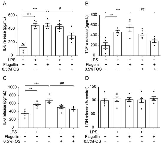 Anti-inflammatory effects of FOS in LPS- or flagellin-treated PBECs. (A) IL-8, (B) TNF-α, (C) IL-6, and (D) LDH release were determined in the supernatants of LPS- or flagellin-treated PBECs. Significantly different from control: ** p < 0.01; *** p < 0.001. Significantly different from flagellin: # p < 0.05; ## p < 0.01. Data are presented as means ± SEM. All data shown are representative of five independent experiments (n = 5 donor calves, one donor calf per experiment). FOS, fructo-oligosaccharides; IL, interleukin; LDH, lactate dehydrogenase; LPS, lipopolysaccharides; TNF, tumor necrosis factor.