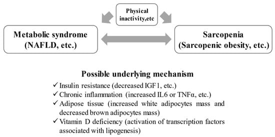 Correlation between metabolic syndrome and sarcopenia. NAFLD; nonalcoholic fatty liver disease, IGF; insulin-like growth factor.
