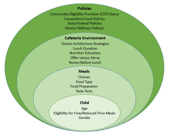- Gross, S.M.; Biehl, E.; Marshall, B.; Paige, D.M.; Mmari, K. Role of the elementary school cafeteria environment in fruit, vegetable, and whole-grain consumption by 6-to 8-year-old students. J. Nutr. Educ. Behav. 2019, 51, 41–47. [Google Scholar] [CrossRef] [PubMed]