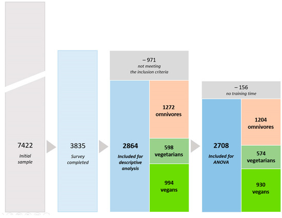 A total number of 7422 participants took part in the survey. However, 48% dropped out, and 3835 runners completed the questionnaire. A group of 834 runners was also excluded from data analysis due to incomplete, inconsistent, and conflicting data sets. Two groups of control questions were included within different sections of the questionnaire to control for running activity and diet measures. Additionally, 156 participants without information considering running training (e.g., training time) were excluded from the study. Moreover, to control for a minimal state of health linked to a minimum level of fitness [36,37] and to further enhance the reliability of data sets, the BMI approach was implemented within data clearance. Therefore, 42 runners with a BMI ≥ 30 were excluded from data analysis. After data clearance, a group of 2864 active recreational runners (including 622 runners in < 21 km, 1032 runners in half-marathon, and 1,210 runners in marathon/ultra-marathon) with complete data sets were included in final data analysis. With regard to diet type, there were 44% (1272) omnivores, 21% (598) vegetarians, and 35% (994) vegans. As 156 runners did not report their training time, the qualitative data analysis was conducted on a group of 2708 participants. Figure 1 shows the flow diagram of participants’ enrollment in the present study.