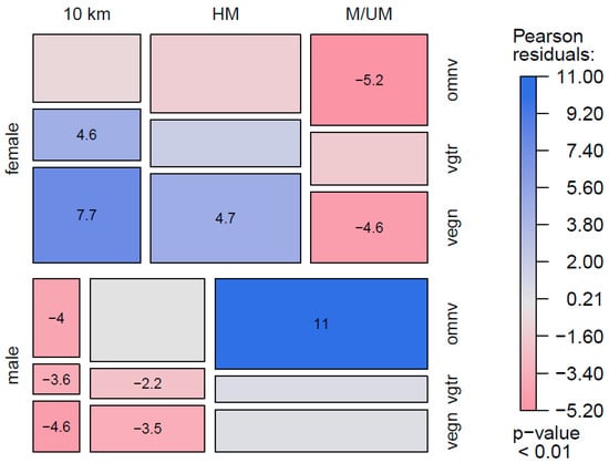 Association between Sex, Race Distance and Dietary Subgroups of Endurance runners. Note: Exceptionally (significantly) high values are visualized with blue and strikingly (significantly) low values are visualized with red. <21 km—less than half-marathon; HM—half-marathon; M/UM—marathon/ultra-marathon. Vegn—vegans: avoid all foods and ingredients from animal sources; vgtr—vegetarians: avoid all flesh foods but consume egg and/or dairy products; omnv—omnivores: have no restriction on source of food.