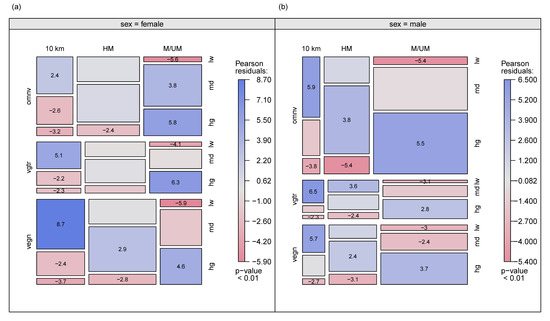 Association between Race Distance, Dietary Subgroup, and Training Mileage displayed by (a) Female Endurance Runners and (b) Male Endurance runners. Note: Exceptionally (significantly) high values are visualized with blue and strikingly (significantly) low values are visualized with red. <21 km—less than half-marathon; HM—half-marathon; M/UM—marathon/ultra-marathon. vegn—vegans: avoid all foods and ingredients from animal sources; vgtr—vegetarians: avoid all flesh foods but consume egg and/or dairy products; omnv—omnivores: have no restriction on source of food. Lw—low training mileage; md—medium training mileage; hg—high training mileage.