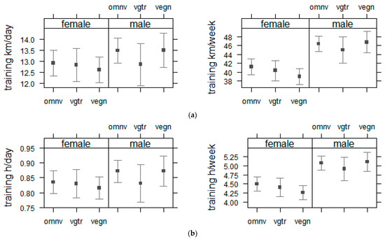 Mean effect size to display the interaction between diet type, sex, and weekly training mileage (a) or weekly training duration (b). Note: Results are presented as mean effect sizes with bars displaying 95%-CI with lower and upper boundaries. Omnv—omnivores: have no restriction on source of food; vgtr—vegetarians: avoid all flesh foods but consume egg and/or dairy products; vegn—vegans: avoid all foods and ingredients from animal sources. km—kilometers; h—hours.