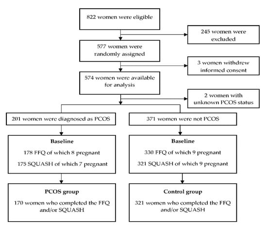 Flow chart of the participants who completed the FFQ and/or SQUASH at the baseline. PCOS: polycystic ovary syndrome, FFQ: food frequency questionnaire, and SQUASH: Short QUestionnaire to ASsess Health-enhancing physical activity.