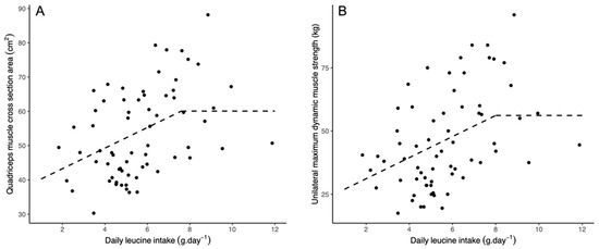 Linear biphasic regression models. (A): Relationship between total daily leucine intake and quadriceps muscle cross-sectional area. (B): Relationship between total daily leucine intake and unilateral maximum dynamic muscle strength.