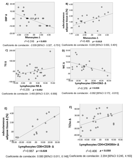There were Δ in anthropometric, biochemical, and body composition variables after intervention. The analysis was adjusted by sex, age, and BMI. It was found that Δ at peripheral level of monocytes correlated negatively with Δ in DBP but positively with Δ in ST, just as Δ in NK lymphocytes correlated positively with Δ in TG. A negative correlation was found between Δ in TCD4+ helper lymphocytes (TCD4+CD62-, effector) and TCD4+ lymphocyte memory cells (TCD4+CD45RO+) and Δ in WC and glucose, respectively. A positive correlation was also observed between Δ in TCD8+ cytotoxic lymphocytes (TCD8+CD28-, effectors) and Δ in ST, and between Δ in TCD4+ virgin lymphocytes (TCD4+CD45RA+) and Δ in TCho, c-LDL, and WC. All these correlations were significant (Table 4).
