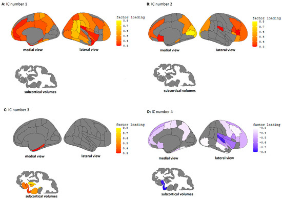 (A). Independent component 1, characterized by high factor loadings in the temporal/parietal and frontal cortex. (B). Independent component 2, characterized by high loadings in the occipital and frontal cortex. (C). Independent component 3, characterized by high loading in the temporal cortex and subcortical volumes. (D). Independent component 4, characterized by high loadings in the temporal cortex.