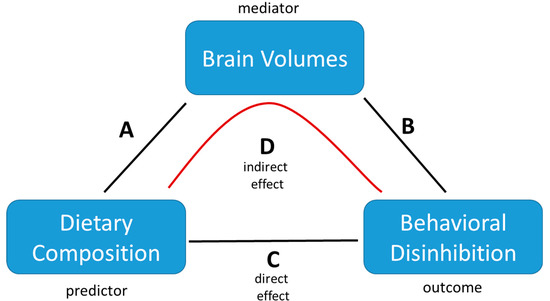 Schematic illustration of the multiple mediation model employed to analyze the associations between dietary composition, brain volumes, and behavioral disinhibition. The model tests for the significance of any of the direct effects (A–C) as well as whether the indirect effect of (D) explains (part of) the total effect. Covariates are not depicted but were included in all analyses (A–D) as described in the text.