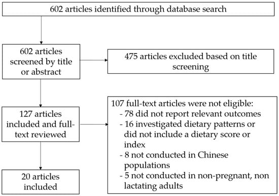 We identified 602 articles from the initial database search (Figure 1). After screening based on title or abstract, 127 papers remained and were included in the full-text review. Of those, 107 were found to have irrelevant outcomes, topics, or study populations and were therefore excluded from the review. After the search and selection process, 20 articles were found to meet all inclusion criteria and were included in the review (Table 1). Of these 20 articles, 12 were cross-sectional studies, and 8 were prospective cohort studies. There were no RCTs that met the inclusion criteria. Fourteen of the articles used a diet quality index designed or modified for the Chinese population such as the tailored AHEI (tAHEI), the CHEI, the adherence to CHFP, the China DQI, DBI, and the dietary diversity score (DDS); five of them included diet quality scores used internationally such as the HEI and AHEI, DASH and aMED scores; and one study included both tailored and internationally used scores. All but one of the five studies that only included internationally used scores were conducted in Chinese populations outside mainland China, while all but one of the 14 studies that used tailored scores were conducted within mainland China. All studies included BMI as an outcome, five of them also assessed the risk of being underweight or overweight and obese, and five of them included WC as an outcome. Four studies had less than 1000 participants, 11 studies had 1000–10,000, and 5 studies had over 10,000 participants. Twelve studies used 24-h dietary recall, seven used a food frequency questionnaire (FFQ), and one used both dietary recall and FFQ to collect dietary information.