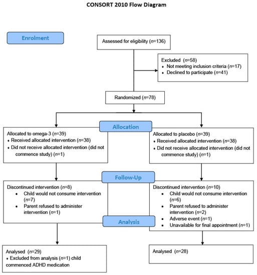 The families of 136 children expressed interest in the study. From these, 78 were randomised to either the omega-3 or the placebo group with 1 child in each group not commencing the study. From the 38 in each group who commenced treatment, 8 withdrew in the omega-3 group and 10 withdrew in the placebo group. Thirty children in the omega-3 group completed the intervention, however 29 were included in the analysis as one child commenced medication for a behavioural condition midway through the trial and was removed from the final analysis but was able to be included in previous feasibility analysis [28]. In the placebo group, 28 children completed the intervention and were included in the analysis. The reasons for participant withdrawal are outlined in Figure 1.