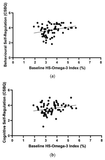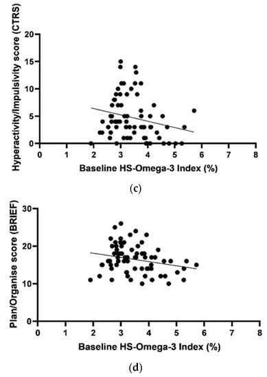 The relationship between the HS-Omega-3 Index® and all outcome measures at baseline were assessed by Spearman correlations. Significant modest correlations were found between the HS-Omega-3 Index® and the CSBQ Behavioural SR scale (r = 0.287, p = 0.015), the CSBQ Cognitive SR (r = 0.242, p = 0.042) and the CTRS Hyperactivity/Impulsivity scale (r = −0.250, p = 0.037). Furthermore, a trend between HS-Omega-3 Index® and the BRIEF raw score for plan/organise scale (r = −0.225, p = 0.061) was detected (Figure 3).